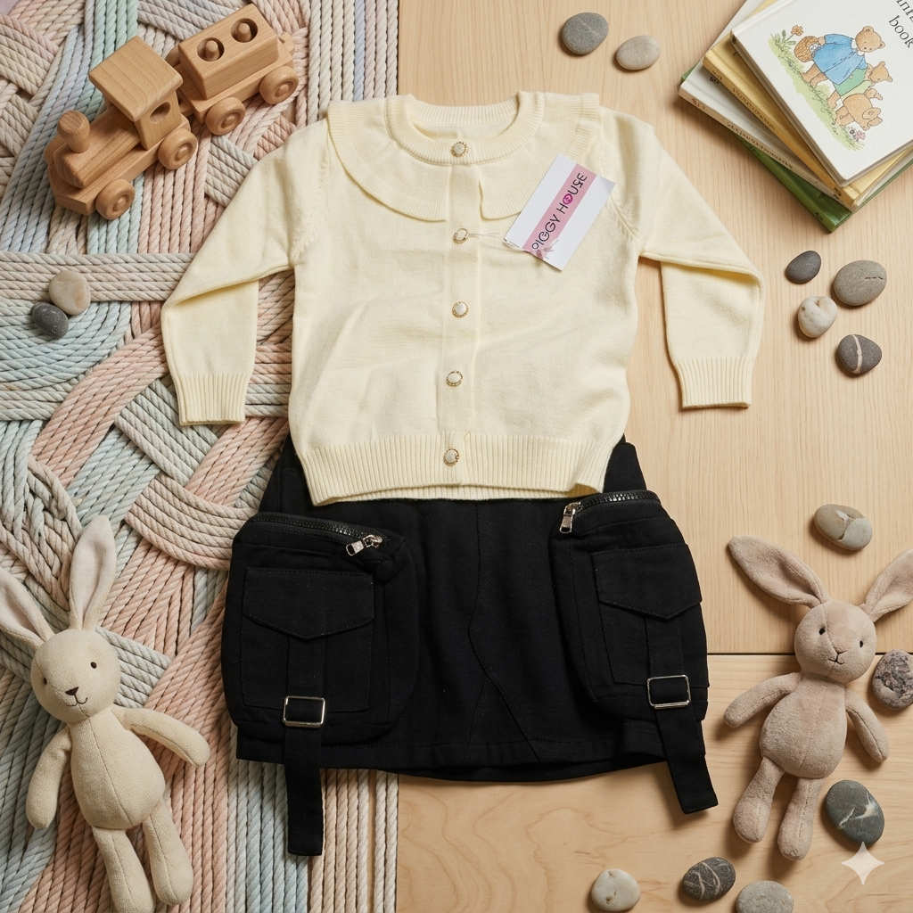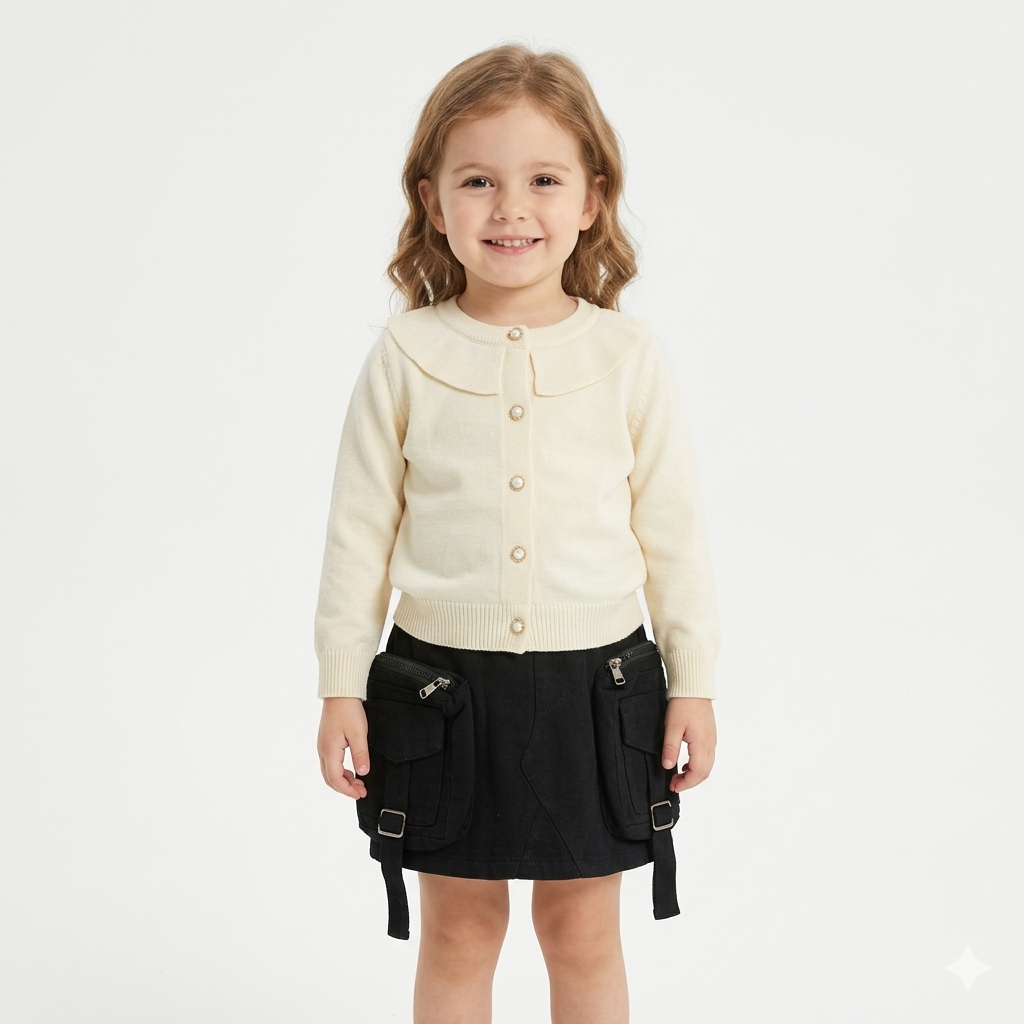 The perfect balance of soft femininity and edgy utility. This curated set pairs a delicate, ruffled knit cardigan with a rugged, multi-pocket cargo skirt. It’s a versatile ensemble that transitions effortlessly from family gatherings to urban adventures, making it a standout choice for her seasonal wardrobe.