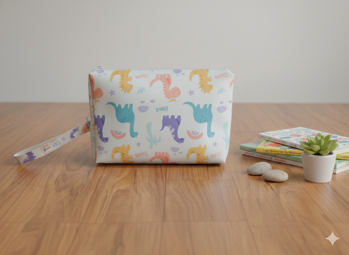 Add some fun and functionality to your day with this adorable Dino-Themed Pouch. Featuring a playful and colorful pattern of dinosaurs in pastel shades, this pouch is perfect for kids and adults alike. Made from durable material, it’s ideal for storing stationery, toiletries, or small essentials. The white background with cheerful dinos makes it a perfect match for any playful or nature-inspired collection.