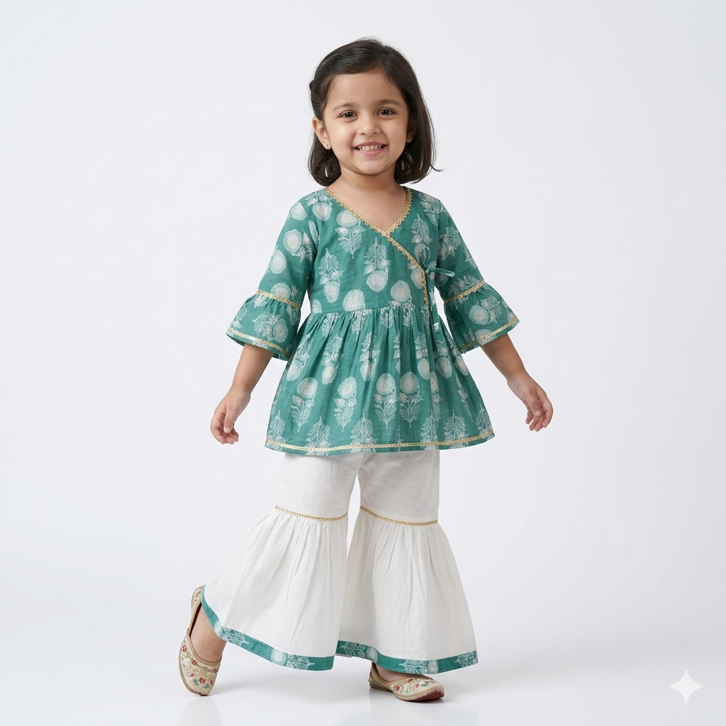 The Angrakha Kurti: The top features a classic Angrakha-style wrap in a deep, rich emerald green. It is adorned with a delicate white floral block-print pattern that offers a timeless appeal. The neckline and tiered bell sleeves are accented with shimmering gold Gota Patti borders, adding a touch of festive sparkle. The side-tie tassel adds a sweet, authentic detail to the wrap design.