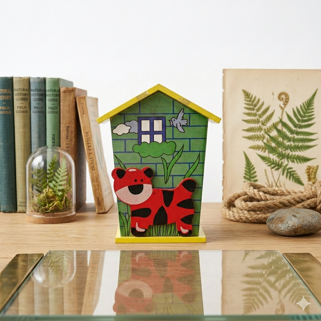 Playful Design: The front showcases a friendly, 3D-effect red tiger against a lush green brick background, complete with a small window, fluffy clouds, and a singing bird.