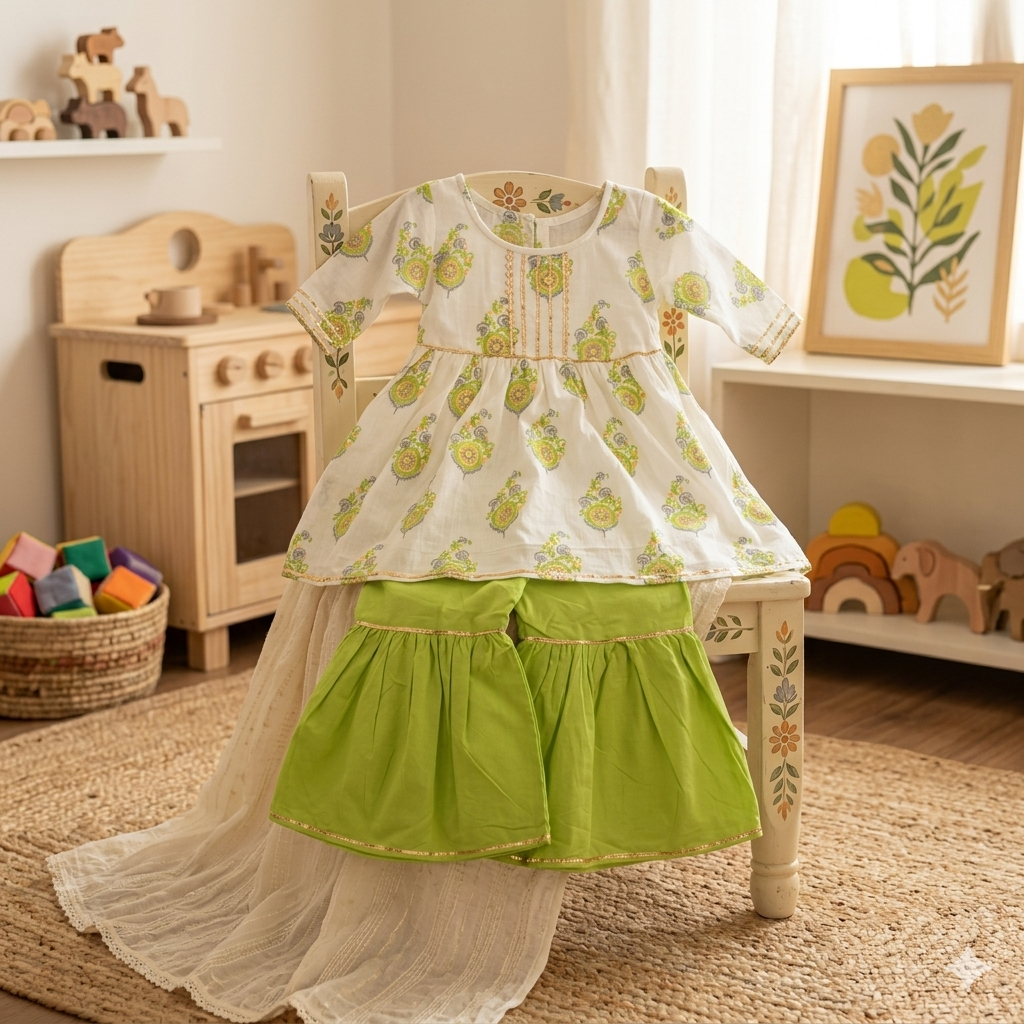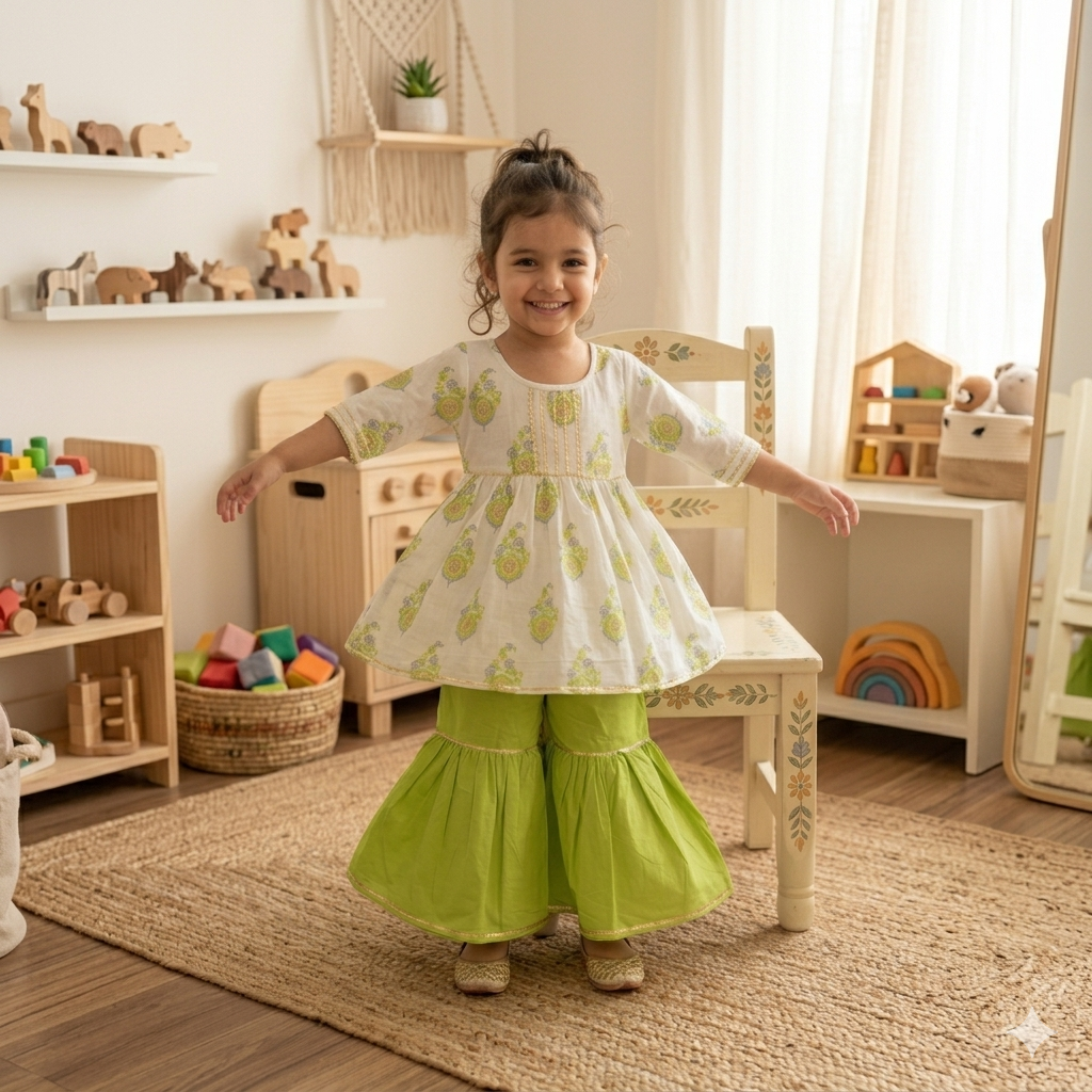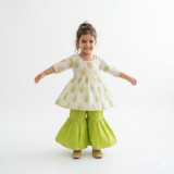 This elegant two-piece ethnic set is designed to bring a touch of traditional charm and modern comfort to any young girl’s wardrobe. Perfect for festive occasions, weddings, or cultural celebrations, this outfit blends delicate craftsmanship with a vibrant, playful aesthetic.