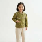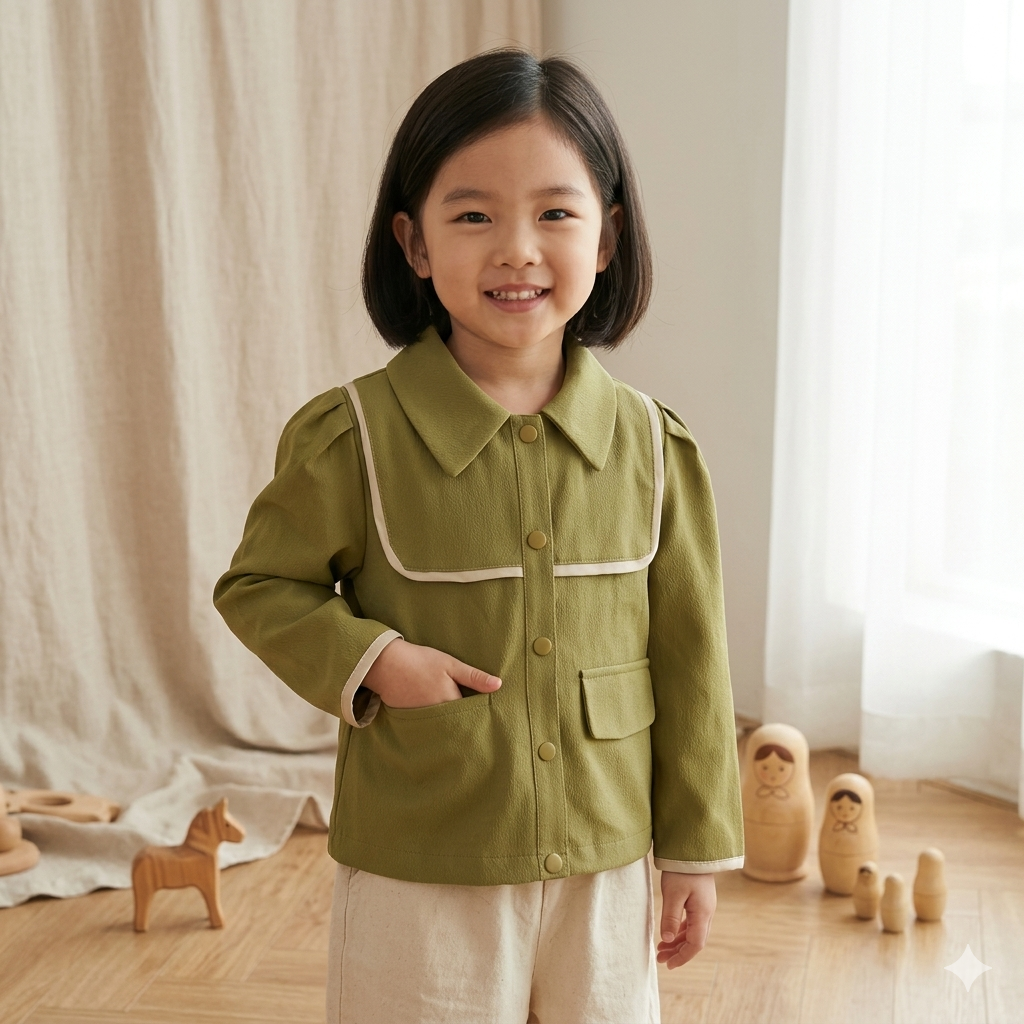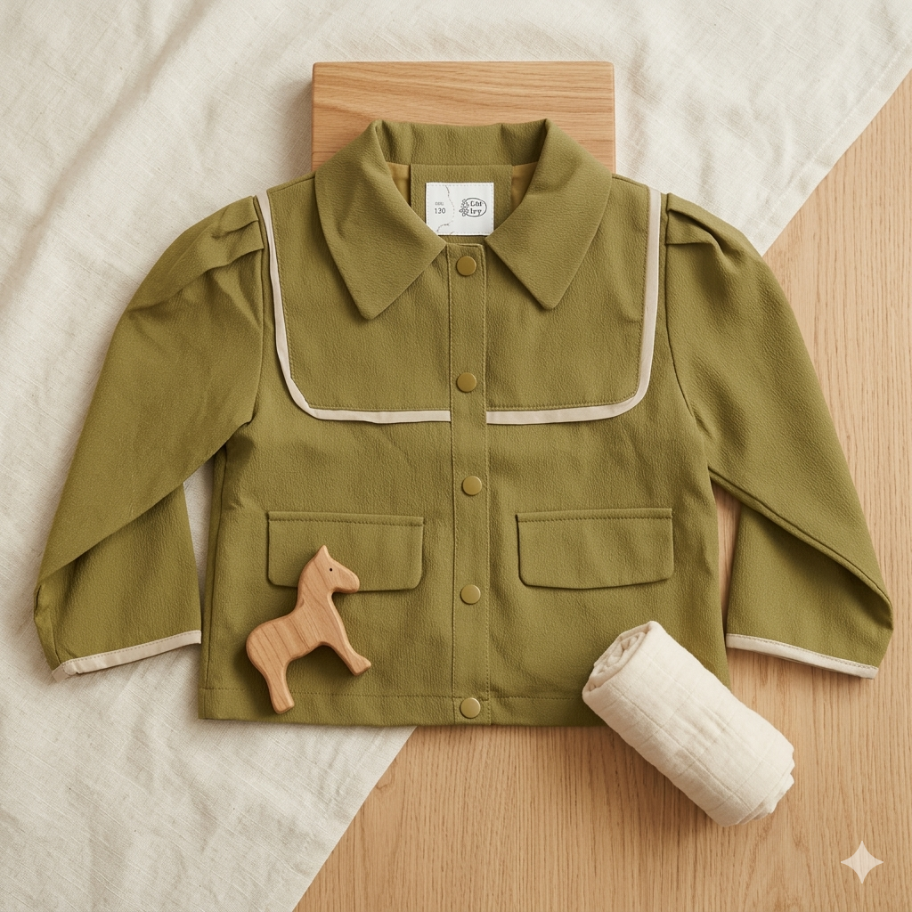 Elevate your little one’s wardrobe with a perfect blend of retro aesthetics and modern comfort. This uniquely designed utility jacket features a sophisticated olive green hue, accented with elegant cream piping that defines its signature silhouette.