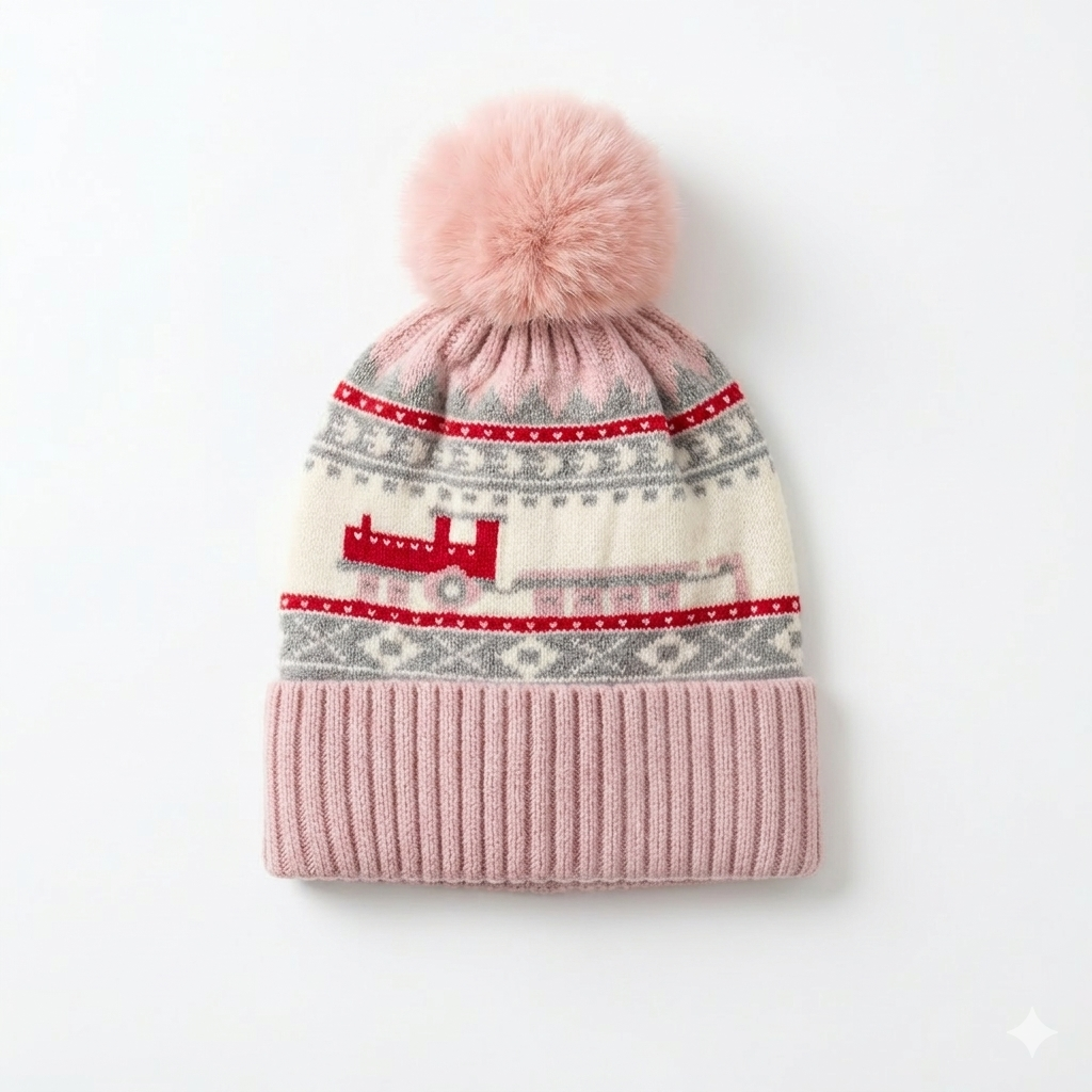 This knitted train beanie is a delightful blend of style and practicality, sure to become a favorite winter accessory for any little one.