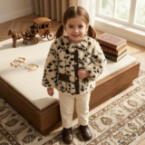 Elevate her winter wardrobe with our signature leopard print jacket. Crafted from ultra-soft, premium faux fur, this piece features sophisticated chocolate-brown faux leather trim and polished gold-tone buttons. Whether she’s heading to a family brunch or a holiday party, this jacket offers the perfect blend of warmth and runway-ready style.