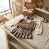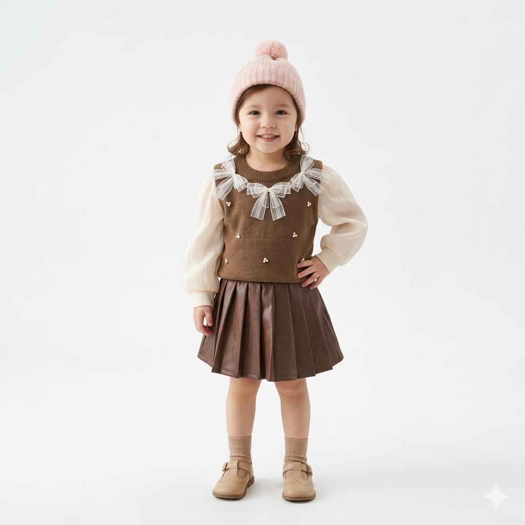 Complementing the top is a high-waisted, pleated faux-leather skirt in a matching deep mocha shade. The structured pleats offer a beautiful “swing” effect when moving, while the faux-leather material adds a modern, high-fashion edge that is both durable and easy to wipe clean.