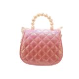 Design & Texture: The bag features a quilted, metallic pink finish that provides a high-shine, iridescent effect. The edges are framed with a delicate white lace ruffle and a string of small faux pearls.